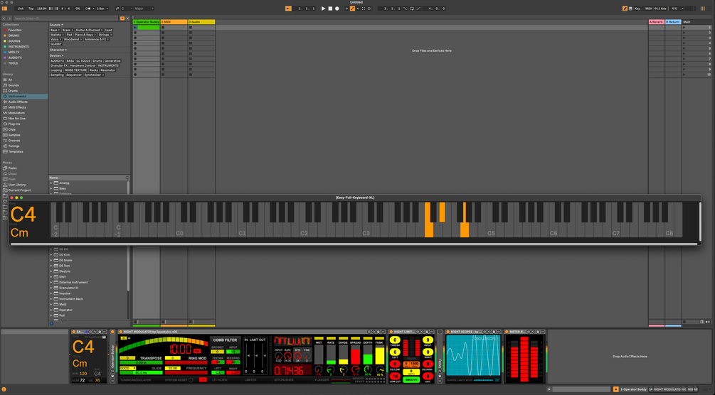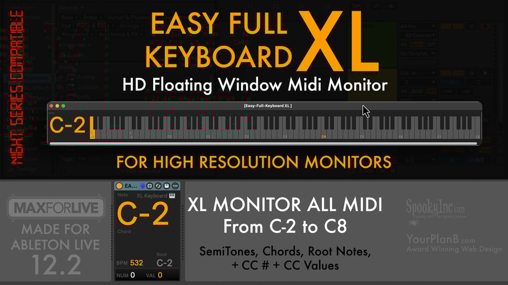 This is a larger version of our floating window, complete range keyboard midi monitor MaxForLive device based on our popular Midi Easy Monitor . This is a keyboard monitor that displays every single semitone from the lowest C-2 all the way up to C8 in a extra large floating window.