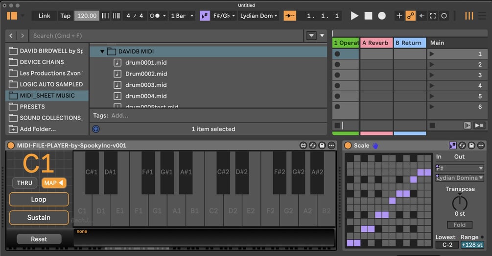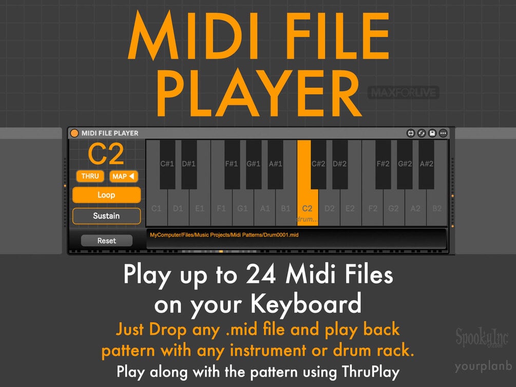 Just add the MIDI FILE PLAYER MaxforLive midi device before any instrument or drum rack to play back 24 midi clips with any sound you can think of. Click Loop to make the midi clip repeat as long as you hold down a key - or click Sustain to hold it down for you.