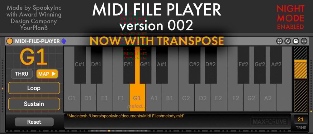 And in keeping with out NIGHT SERIES devices, we have activated Night mode on the Midi FIle Player, while keeping this device still very light on the CPU (between 0-1%). Just click the large note display in the top left to toggle between Ableton orange and NIGHT SERIES red.