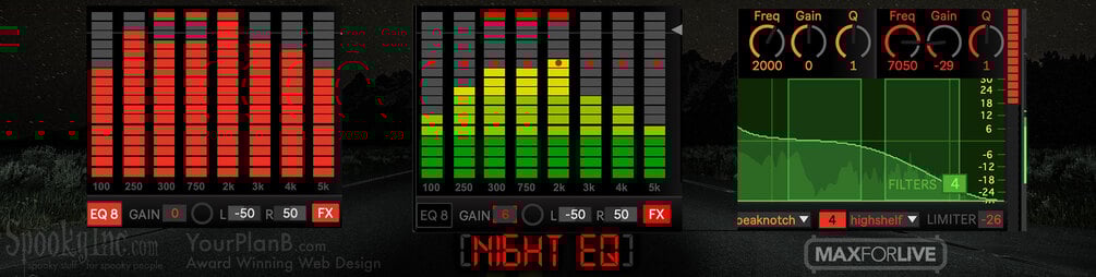 An old school style 8 EQ / graphic equalizer in our NIGHT series of Max for Live devices. Chose between standard (green and yellow) and NIGHT mode (red) level meter bars.