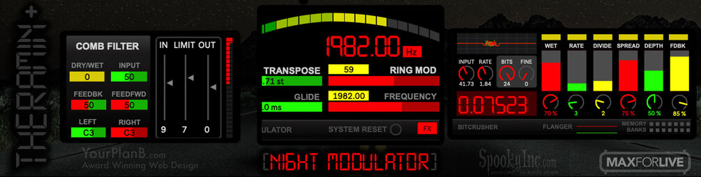 NIGHT MODULATOR is a vast array of FX designed to fit in with the NIGHT series of Max4Live devices. We’ve pushed all the limits with this device. Adjust the input Gain, transpose the signal up or down 36 semitones, and add a classic Ring Modulator - with a wide Hz range from 0-3000 - set in a classic retro 80s action dashboard style design of the NIGHT series.